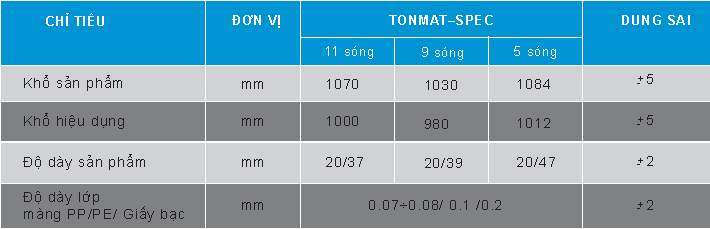- THÔNG SỐ KỸ THUẬT CHUNG CỦA TẤM LỢP TONMAT – SPEC